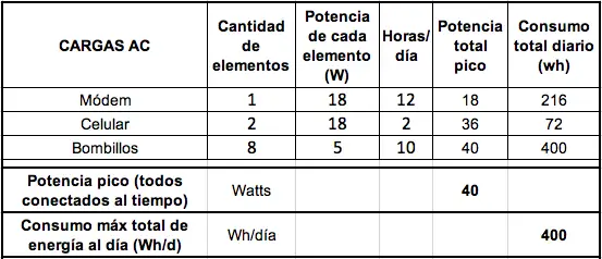 Tabla Ejemplo de cargas para una casa pequeña, sin acceso a la red.