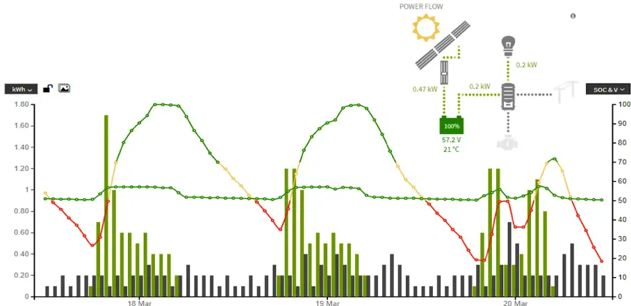 Ilustración 2. Ejemplo del comportamiento de la carga y descarga de las baterías (SOC) durante 3 días, en un sistema solar fotovoltaico off-grid correctamente dimensionado.