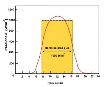 Las horas solares pico, es una forma más fácil de calcular la energía producida por los paneles solares. Es una representación rectangular de la campana de irradiancia solar (áreas equivalentes)