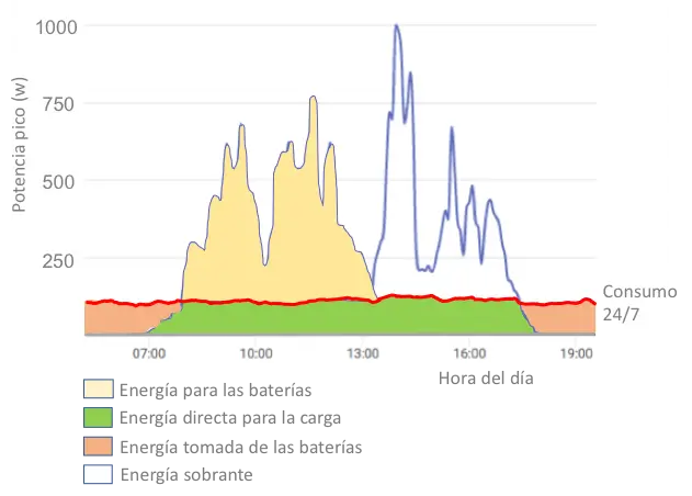Para contar con disponibilidad de energía durante las 24 horas, los paneles solares deben suminstrar la energía suficiente para cargar las baterías y además la energía para alimentar las cargas durante el todo el día. Al final de la tarde, las baterías deben soportar el consumo hasta la madrugada del siguiente día, cuando vuelven a aparecer los rayos solares. Independientemente de si el consumo más alto es durante la noche, durante el día, o relativamente igual durante las 24 horas, se debe dimensionar el sistema para tener el respaldo continuo.