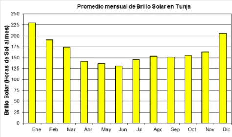 Para el caso de este ejemplo, Duitama, se puede determinar el mes con menos horas solares usando el ratón del computador. A estación meteorológica más cercana a Duitama es Tunja, de donde se puede ver que el mes con menos horas de sol pico es junio, con un poco más de 125 horas efectivas al mes.