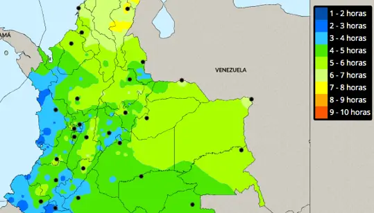 Así, y con ayuda del mapa solar del http://atlas.ideam.gov.co/, se determina este número de horas pico solares (brillo solar):